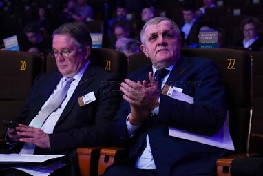 Член Комитета Совета Федерации по бюджету и финансовым рынкам Евгений Савченко (слева) и генеральный директор ООО «Машиностроительный завод «Тонар» Денис Кривцов во время пленарной дискуссии «Экономика: новая реальность – новые подходы» на Московском экономическом форуме – 2024 в Цифровом деловом пространстве.
