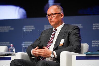 Немецкий предприниматель, общественный деятель, основатель российско-немецкого общественного проекта «Бисмарк-диалог» Александр фон Бисмарк во время пленарной дискуссии «Экономика: новая реальность – новые подходы» на Московском экономическом форуме – 2024 в Цифровом деловом пространстве.