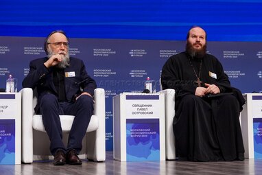 Философ, политолог и социолог Александр Дугин (слева) и священнослужитель Русской православной церкви, проповедник, миссионер Павел Островский во время пленарной дискуссии «Культура и пропаганда: новая реальность – новые люди» на Московском экономическом форуме – 2024 в Цифровом деловом пространстве.