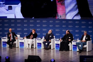 Священнослужитель Русской православной церкви, проповедник, миссионер Павел Островский (слева) во время пленарной дискуссии «Культура и пропаганда: новая реальность – новые люди» на Московском экономическом форуме – 2024 в Цифровом деловом пространстве.