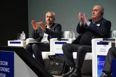 Советник по экономике Центра прогресса и развития при президенте Исламской республики Иран Рухолла Абуджафари (слева) и директор Центра российских исследований факультета международных отношений Ереванского государственного университета, председатель общественной организации «Интеграция и развитие» Арам Сафарян во время сессии «Евразийские транспортные коридоры» на Московском экономическом форуме – 2024 в Цифровом деловом пространстве.