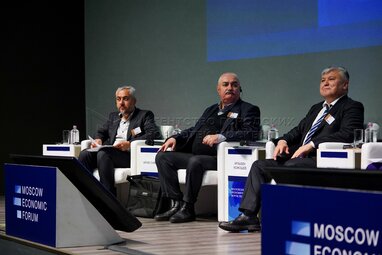 Советник по экономике Центра прогресса и развития при президенте Исламской республики Иран Рухолла Абуджафари, директор Центра российских исследований факультета международных отношений Ереванского государственного университета, председатель общественной организации «Интеграция и развитие» Арам Сафарян и член Коллегии (министр) по энергетике и инфраструктуре Евразийской экономической комиссии Арзыбек Кожошев (слева направо) во время сессии «Евразийские транспортные коридоры» на Московском экономическом форуме – 2024 в Цифровом деловом пространстве.
