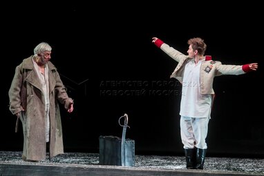 Актеры Юрий Сазонов в роли отца Гринева (слева) и Максим Чиков в роли Гринева во время премьеры спектакля «Капитанская дочка» по повести Александра Пушкина в Центральном академическом театре Российской армии.