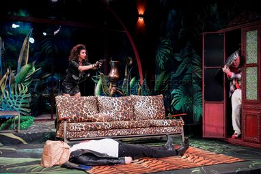 Актеры Владимир Шульга в роли Сидни Траша и Лана Крымова в роли Корал во время пресс-показа спектакля «Мой дом – твой дом» в Театре на Трубной.