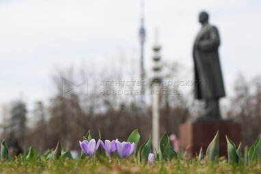 Люди гуляют на Поклонной горе в теплый весенний день в Москве.