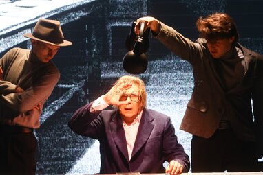 Актер Владислав Демченко (в центре) во время показа театрально-документального спектакля «Королев. Главный» в Музее космонавтики в Москве.