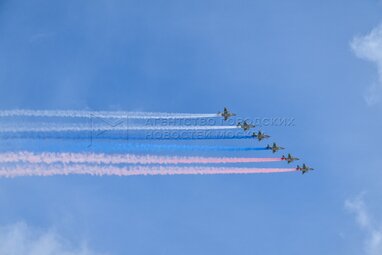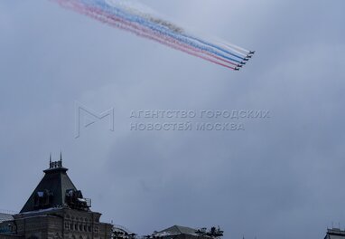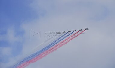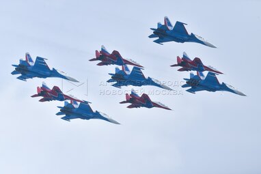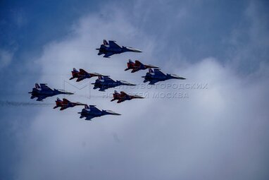 Строй «кубинский бриллиант» из истребителей МиГ-29 и Су-30СМ пилотажных групп «Русские витязи» и «Стрижи» во время военного парада, посвященного 79-й годовщине Победы в Великой Отечественной войне на Красной площади.