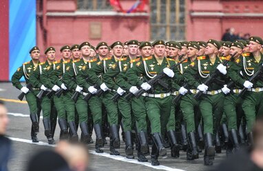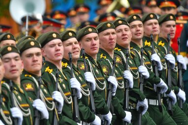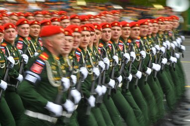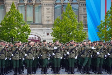 Курсанты и военнослужащие Военного университета Министерства обороны во время военного парада, посвященного 79-й годовщине Победы в Великой Отечественной войне на Красной площади.