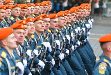 Парадный расчет МЧС РФ во время военного парада, посвященного 79-й годовщине Победы в Великой Отечественной войне на Красной площади.