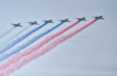 Штурмовики Су-25БМ во время военного парада, посвященного 79-й годовщине Победы в Великой Отечественной войне на Красной площади.