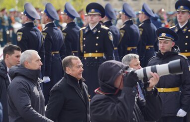 Заместитель председателя Совета безопасности РФ Дмитрий Медведев (слева по центру) во время военного парада, посвященного 79-й годовщине Победы в Великой Отечественной войне на Красной площади.