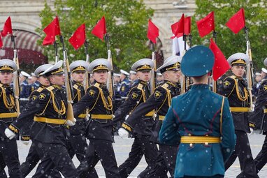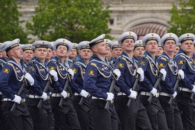 Курсанты Тихоокеанского высшего военно-морского училища имени С.О. Макарова во время военного парада, посвященного 79-й годовщине Победы в Великой Отечественной войне на Красной площади.