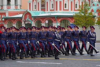 Парадный расчет Великого войска Донского во время военного парада, посвященного 79-й годовщине Победы в Великой Отечественной войне на Красной площади.
