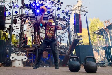 Вадим Степанцов с группой «Бахыт-Компот» на праздничном концерте в честь открытия мотосезона -2024 мотоклуба «Ночные волки» в Байк-Центре Sexton (Нижние Мневники).