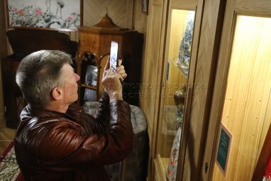 Советник директора ФСО России, заведующий кафедрой истории России XX–XXI веков исторического факультета МГУ имени М.В. Ломоносова Сергей Девятов во время открытия в Музее Гаража особого назначения ФСО России на ВДНХ экспозиции с воссозданными интерьерами Ближней дачи Сталина.