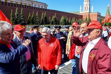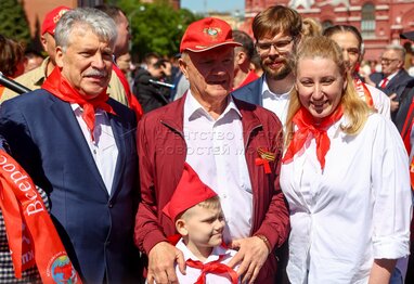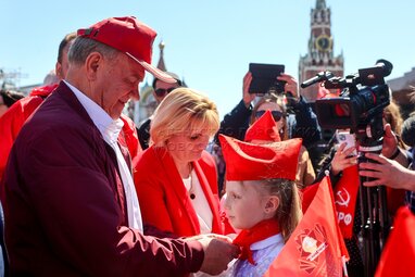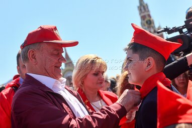 Председатель ЦК КПРФ Геннадий Зюганов (справа) во время торжественной церемонии приема в пионеры на Красной площади школьников из Москвы, Московской области и регионов Центрального федерального округа.
