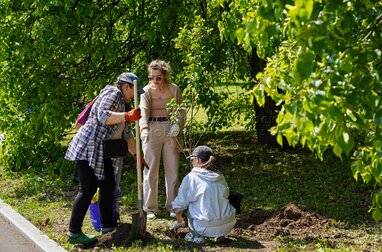 Актриса Елизавета Рыжих (в центре) во время посадки вишневых деревьев на аллее московского театра Et Cetera в парке имени Юрия Лужкова в Южном административном округе Москвы.