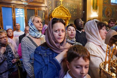 Верующие во время Божественной литургии в праздник перенесения мощей святителя и чудотворца Николая из Мир Ликийских в Бар в Спасо-Преображенском соборе Николо-Угрешского ставропигиального мужского монастыря.
