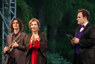 Музыкант Ильяс Невретдинов, актриса Елизавета Арзамасова, артист Московского театра оперетты Александр Бабик (слева направо) на XXXIII церемонии награждения первой театральной премией «Хрустальная Турандот» в музее-усадьбе «Архангельское».