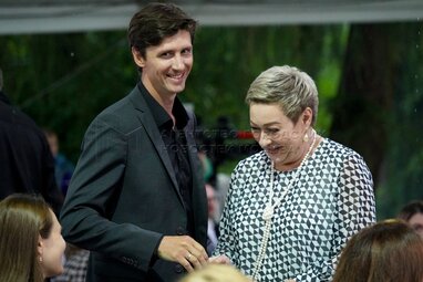 Артист Московского театра оперетты Александр Бабик (в центре) и актриса Виктория Исакова на XXXIII церемонии награждения первой театральной премией «Хрустальная Турандот» в музее-усадьбе «Архангельское».