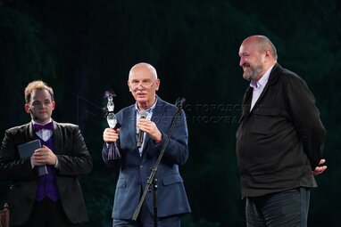 Артист Московского театра оперетты Александр Бабик, театральный художник-постановщик России Владимир Арефьев и режиссер МХТ имени А.П. Чехова Сергей Женовач (слева направо) на XXXIII церемонии награждения первой театральной премией «Хрустальная Турандот» в музее-усадьбе «Архангельское».