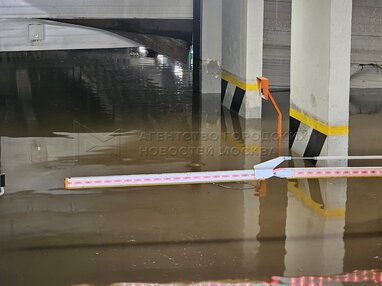 Работа коммунальных и оперативных служб по откачке воды после сильного ливня из подземного паркинга в ЖК на ул. Лобненская.