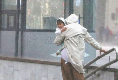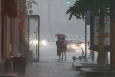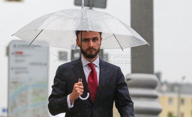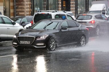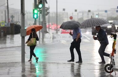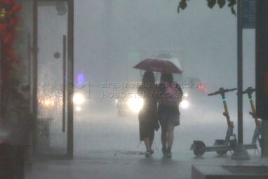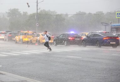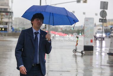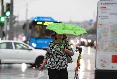Сильный дождь в Москве 20 июня. Мужчина на электросамокате.
