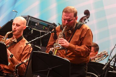 Художественный руководитель и главный дирижер оркестра джазовой музыки имени Олега Лундстрема – Борис Фрумкин (слева). Закрытие II Московского летнего музыкального фестиваля «Зарядье» в большом амфитеатре под открытым небом.