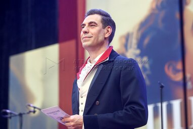 Телеведущий Павел Воля. «Пушкинский бал» в Гостином дворе в рамках финала Международного молодежного конкурса дизайнеров, модельеров одежды и театральных художников на лучший костюм, вдохновленный героями произведений А.С. Пушкина.