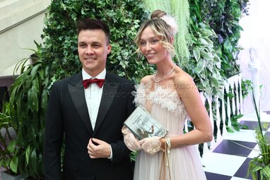 Шестикратная обладательница кубка мира по художественной гимнастике Лейсан Утяшева и ее супруг телеведущий Павел Воля. «Пушкинский бал» в Гостином дворе в рамках финала Международного молодежного конкурса дизайнеров, модельеров одежды и театральных художников на лучший костюм, вдохновленный героями произведений А.С. Пушкина.