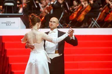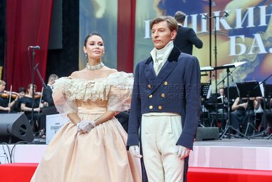 Ведущие Пушкинского бала – актеры Екатерина Гусева и Дмитрий Дюжев. «Пушкинский бал» в Гостином дворе в рамках финала Международного молодежного конкурса дизайнеров, модельеров одежды и театральных художников на лучший костюм, вдохновленный героями произведений А.С. Пушкина.