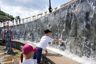 Пешеходный фонтан на ВДНХ у Москвариума. Жаркая солнечная погода в центре Москвы 2 июля 2024 года.