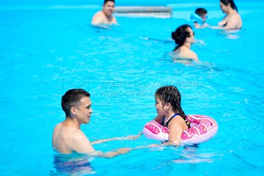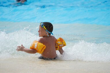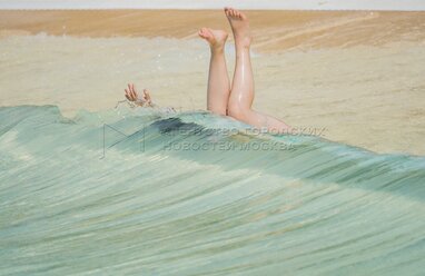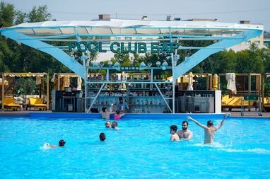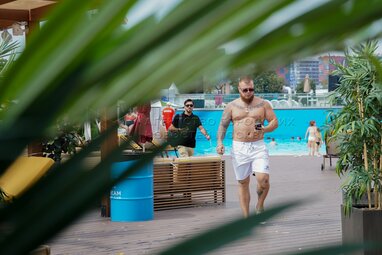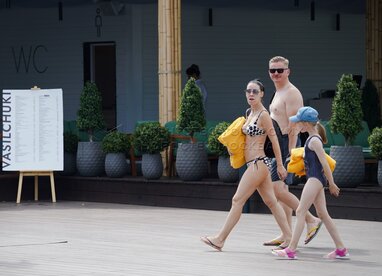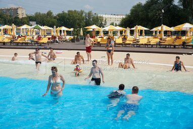 Отдых горожан в пляжном комплексе Dream Beach Club в Нагатинской пойме возле парка развлечений «Остров мечты».