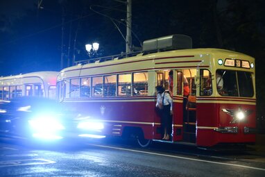 Колонна исторических трамваев во время первой ночной репетиции торжественного парада ретротранспорта на Чистопрудном бульваре ко Дню Московского транспорта.