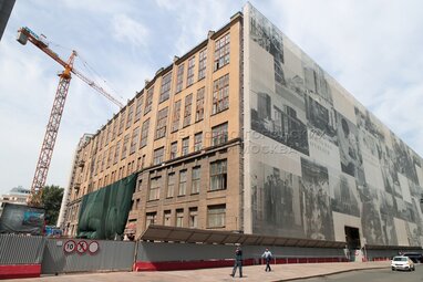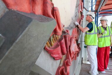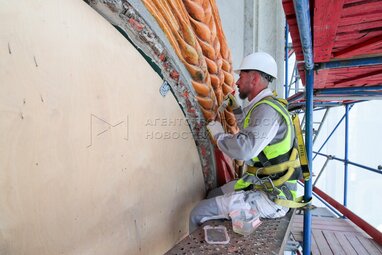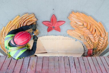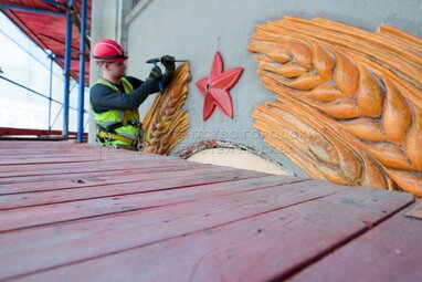 Работы по реставрации фасада здания Центрального телеграфа и советского герба над главным входом.