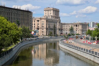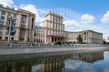 Здание главного учебного корпуса Московского государственного технического университета (МГТУ) имени Баумана (часть здания, построенная в 1949-1960 гг. по проекту Л.К. Комаровой), вид со стороны реки Яуза.