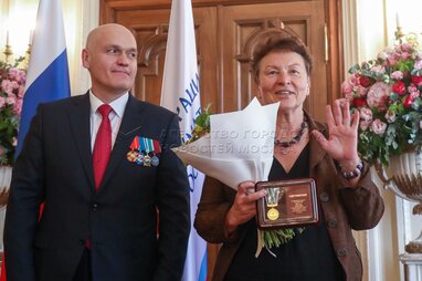 Президент Федерации шахмат России Андрей Филатов (слева) и гроссмейстер, четырехкратная чемпионка России Валентина Гунина. Торжественное вручение государственных наград шахматистам РФ – медалей в честь 100-летия министерства спорта России и золотых знаков Федерации шахмат России – в Центральном доме шахматиста имени Ботвинника.