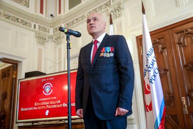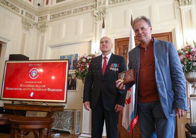 Юбилейная медаль, посвященная 100-летию образования государственного органа управления в сфере физической культуры и спорта. Торжественное вручение государственных наград шахматистам РФ – медалей в честь 100-летия министерства спорта России и золотых знаков Федерации шахмат России – в Центральном доме шахматиста имени Ботвинника.