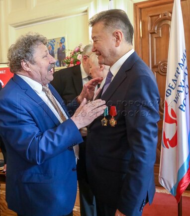 Президент Федерации шахмат России Андрей Филатов (слева) и гроссмейстер, заслуженный тренер РФ, чемпион России, чемпион Европы по быстрым шахматам, тренер мужской сборной России по шахматам Александр Рязанцев. Торжественное вручение государственных наград шахматистам РФ – медалей в честь 100-летия министерства спорта России и золотых знаков Федерации шахмат России – в Центральном доме шахматиста имени Ботвинника.