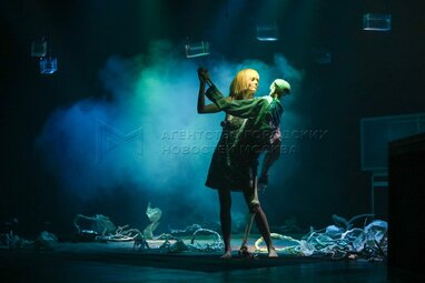Актеры Николай Рысев в роли Алонзо, короля Неополитанского и Евгения Леонова в роли Ариэль, духа, покорного Просперо. Показ премьерного спектакля Театра Москвы «Буря» в постановке Ивана Шалаева на сцене Московского драматического театра имени Ермоловой.