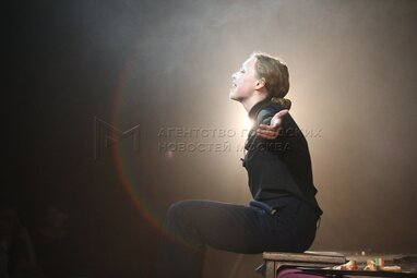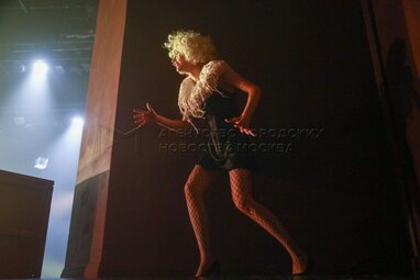 Актриса Ксения Галибина в роли Тринкуло, шута. Показ премьерного спектакля Театра Москвы «Буря» в постановке Ивана Шалаева на сцене Московского драматического театра имени Ермоловой.