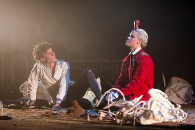 Актеры Николай Рысев в роли Алонзо, короля Неополитанского (слева) и Александр Трачевский в роли Фердинанда, сына короля Неополитанского. Показ премьерного спектакля Театра Москвы «Буря» в постановке Ивана Шалаева на сцене Московского драматического театра имени Ермоловой.