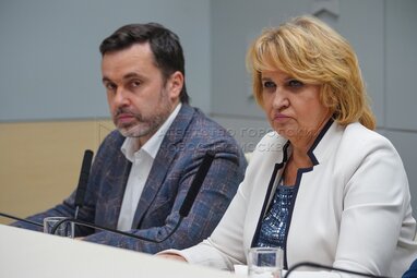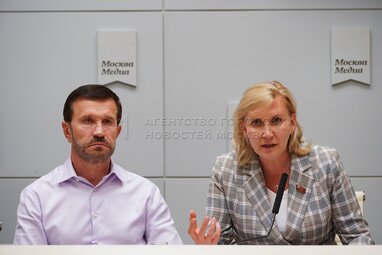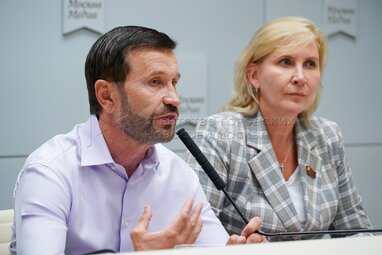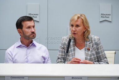 Депутаты Мосгордумы Александр Семенников и Наталия Метлина. Пресс-конференция «Готовимся к 80-летию Великой Победы: ЮЗАО» в пресс-центре Агентства городских новостей «Москва».