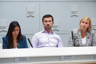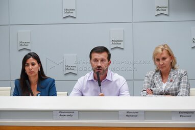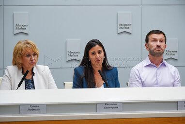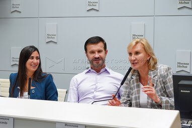 Депутат Мосгордумы Людмила Гусева, руководитель волонтерского центра «Доброе место. ЮЗАО» Екатерина Раззакова и депутат Мосгордумы Александр Семенников (слева направо). Пресс-конференция «Готовимся к 80-летию Великой Победы: ЮЗАО» в пресс-центре Агентства городских новостей «Москва».