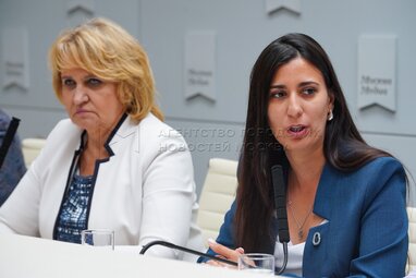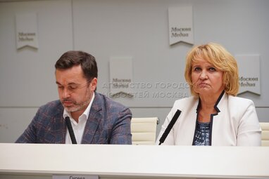 Руководитель волонтерского центра «Доброе место. ЮЗАО» Екатерина Раззакова и депутат Мосгордумы Александр Семенников. Пресс-конференция «Готовимся к 80-летию Великой Победы: ЮЗАО» в пресс-центре Агентства городских новостей «Москва».