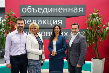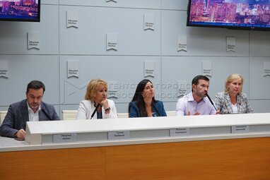 Директор краеведческого общества «Бутово» Антон Никулин, депутат Мосгордумы Людмила Гусева, руководитель волонтерского центра «Доброе место. ЮЗАО» Екатерина Раззакова, депутаты Мосгордумы Александр Семенников и Наталия Метлина, модератор – ведущая телеканала «Москва 24» Екатерина Фоменко (слева направо). Пресс-конференция «Готовимся к 80-летию Великой Победы: ЮЗАО» в пресс-центре Агентства городских новостей «Москва».
