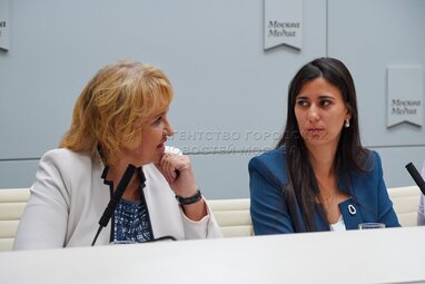 Депутат Мосгордумы Наталия Метлина (слева) и модератор – ведущая телеканала «Москва 24» Екатерина Фоменко. Пресс-конференция «Готовимся к 80-летию Великой Победы: ЮЗАО» в пресс-центре Агентства городских новостей «Москва».