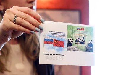 Церемония гашения почтовых марок, посвященных первому дню рождения панды Катюши в Московском зоопарке.