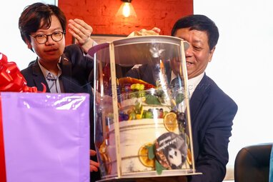 Чрезвычайный и полномочный посол КНР в РФ Чжан Ханьхуэй (справа) передает торт для панды Катюши. Церемония гашения почтовых марок, посвященных первому дню рождения панды Катюши в Московском зоопарке.