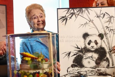 Первый заместитель председателя Общества российско-китайской дружбы, почетный доктор Института Дальнего Востока РАН Галина Куликова. Церемония гашения почтовых марок, посвященных первому дню рождения панды Катюши в Московском зоопарке.